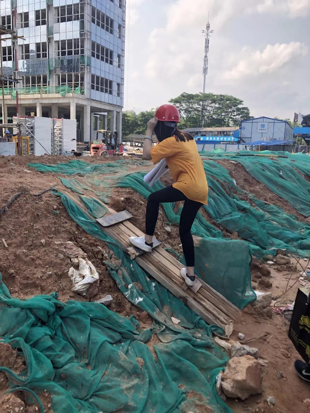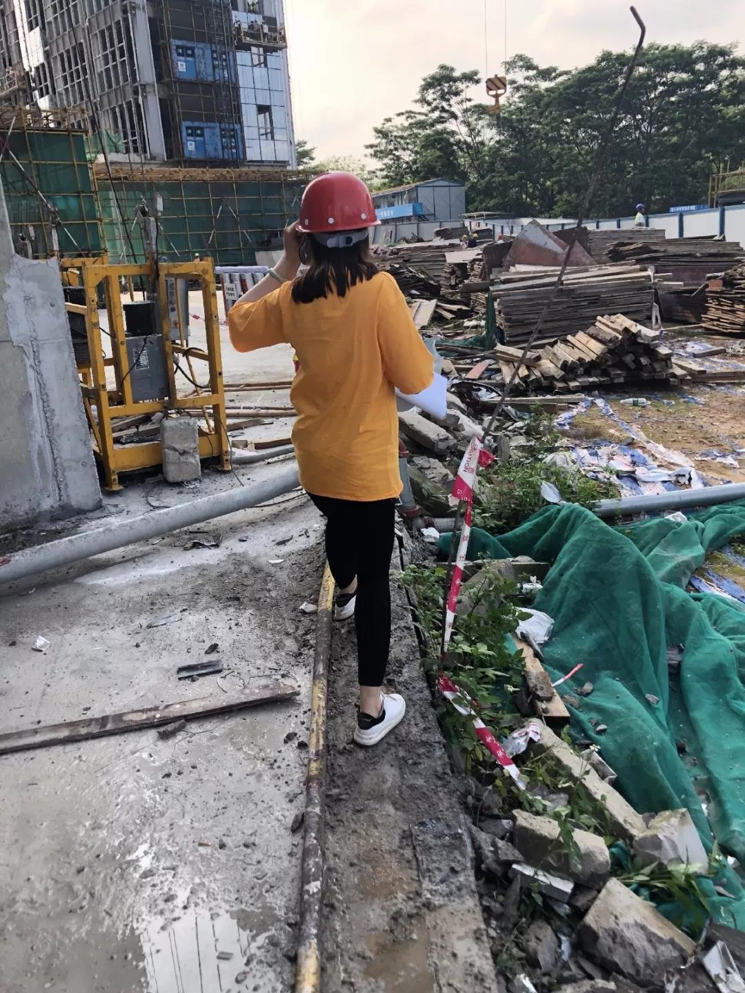 烈日似火,灰尘飞扬。同事戴着清静帽穿行在泥泞缭乱的工地之中,每一步都凝聚着对这份事情的执着和热爱,没一个身影都透漏出她们的无畏与顽强。谁说女子不如男,她们穿得了高跟,也踏得起平底;攀得上岑岭,也下得了土坑。不畏风雨,不惧烈日!